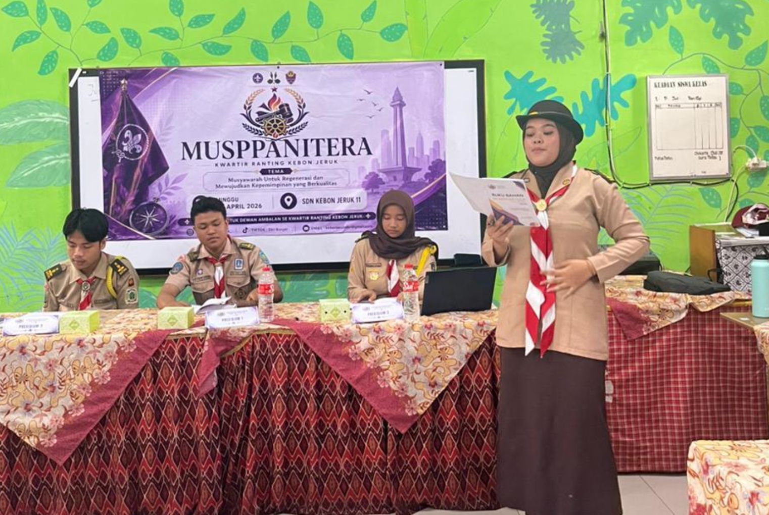 Jakarta Barat — Musyawarah Pramuka Penegak dan Pandega Putri Putra (Musppanitera) Ranting Kebon Jeruk Tahun 2026 resmi menetapkan kepengurusan baru Dewan Kerja Ranting (DKR) untuk masa bakti 2026–2029. Kegiatan yang diikuti 33 peserta ini berlangsung sejak pukul 07.00 WIB hingga selesai dan menjadi momentum penting regenerasi kepemimpinan Pramuka di wilayah tersebut.