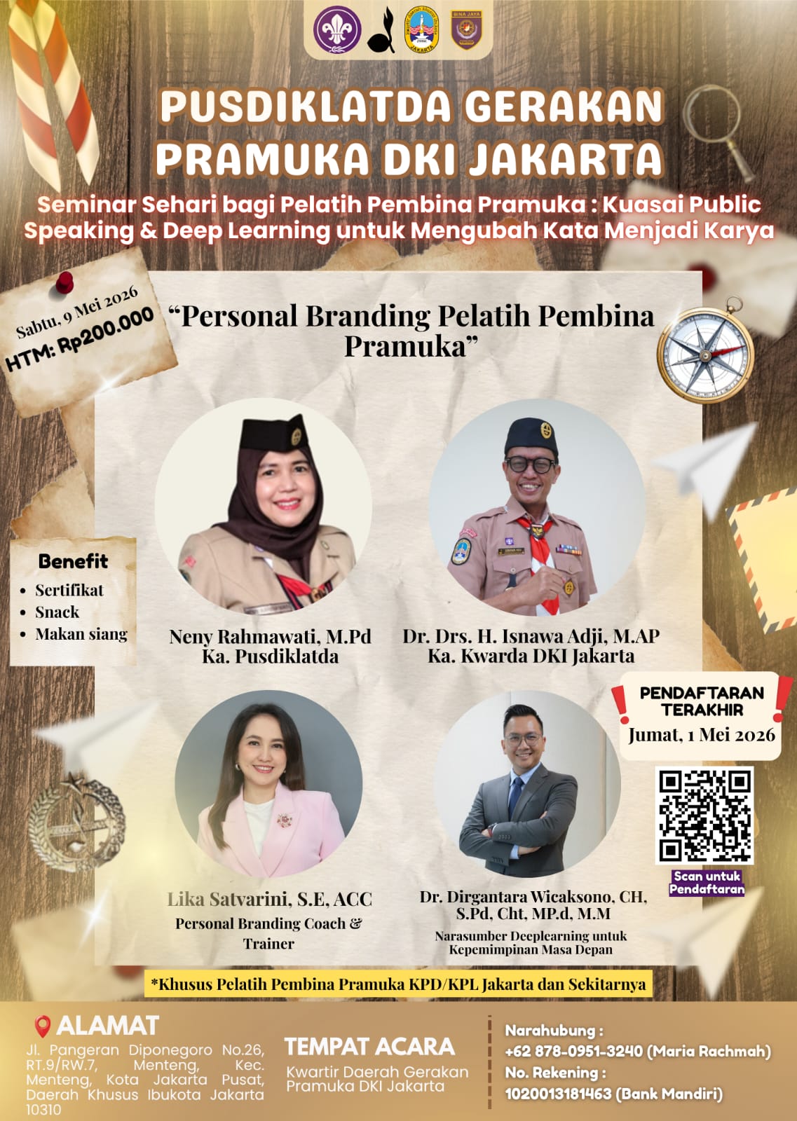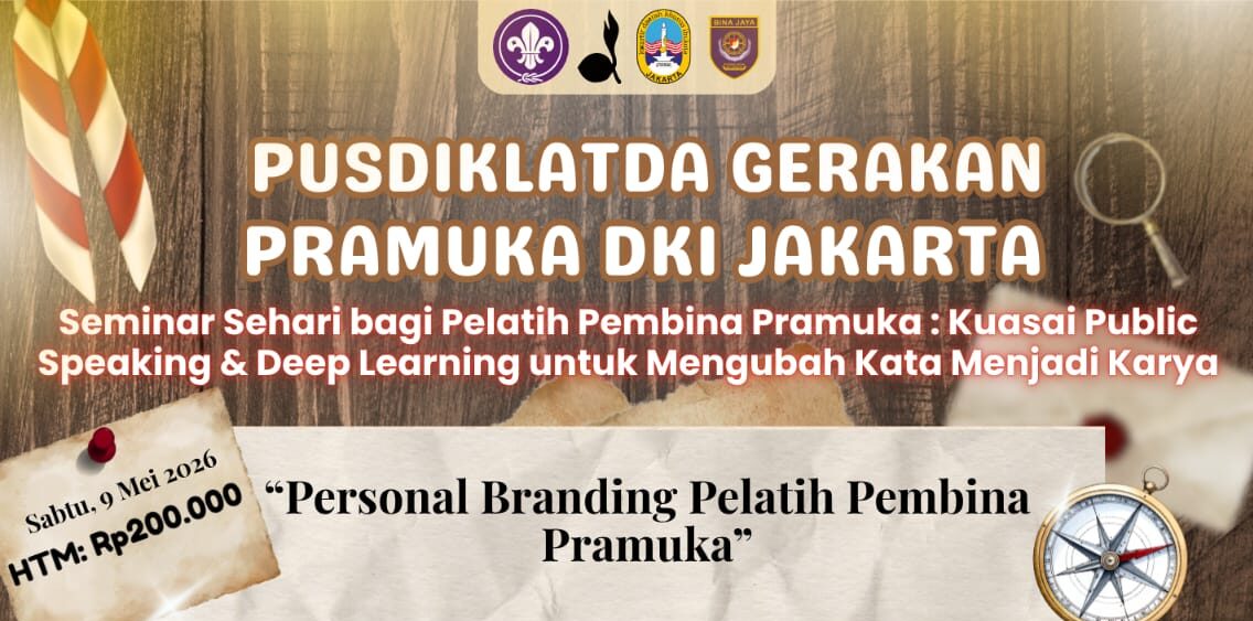 Jakarta — Kwartir Daerah (Kwarda) Gerakan Pramuka DKI Jakarta melalui Pusat Pendidikan dan Pelatihan (Pusdiklat) Kepramukaan akan menyelenggarakan seminar bertajuk “Pramuka DKI Jakarta Unggul: Kuasai Public Speaking dan Deep Learning untuk Kepemimpinan Masa Depan” pada Sabtu, 9 Mei 2026.