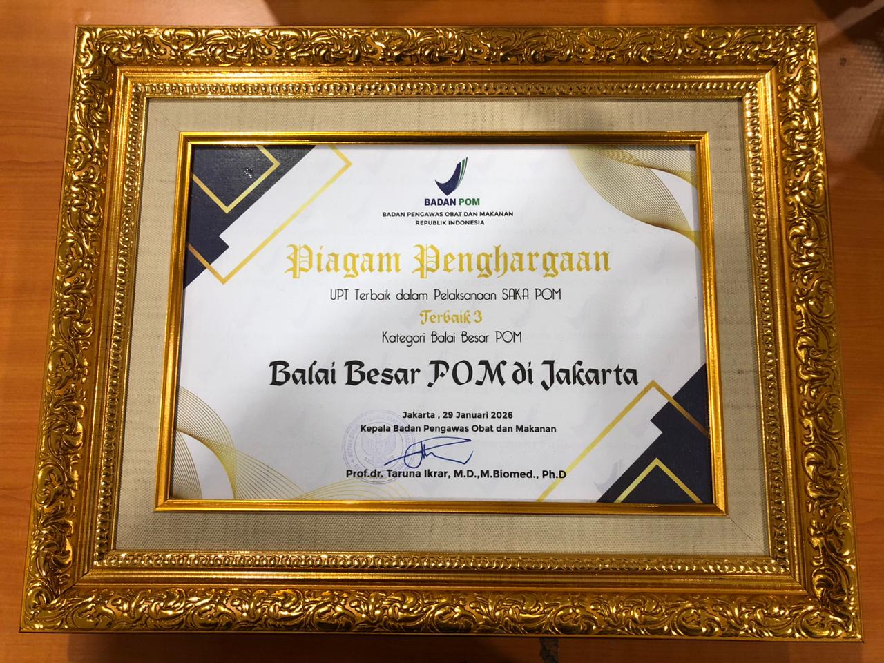 Jakarta – Mengawali tahun 2026, BBPOM di Jakarta menorehkan prestasi dengan meraih penghargaan Unit Pelaksana Teknis (UPT) terbaik ke III dalam rangka pelaksanaan Saka POM Tahun 2025. Penghargaan ini diberikan dalam rangka Hari Ulang Tahun (HUT) BPOM ke-25 yang bertema “Komitmen 25 Tahun Mengawal Kualitas dan Keamanan Obat serta Makanan Menuju Indonesia Emas 2045”. Penghargaan diberikan pada Kamis (29/1/2026) di kantor BPOM, Percetakan Negara Jakarta Pusat.