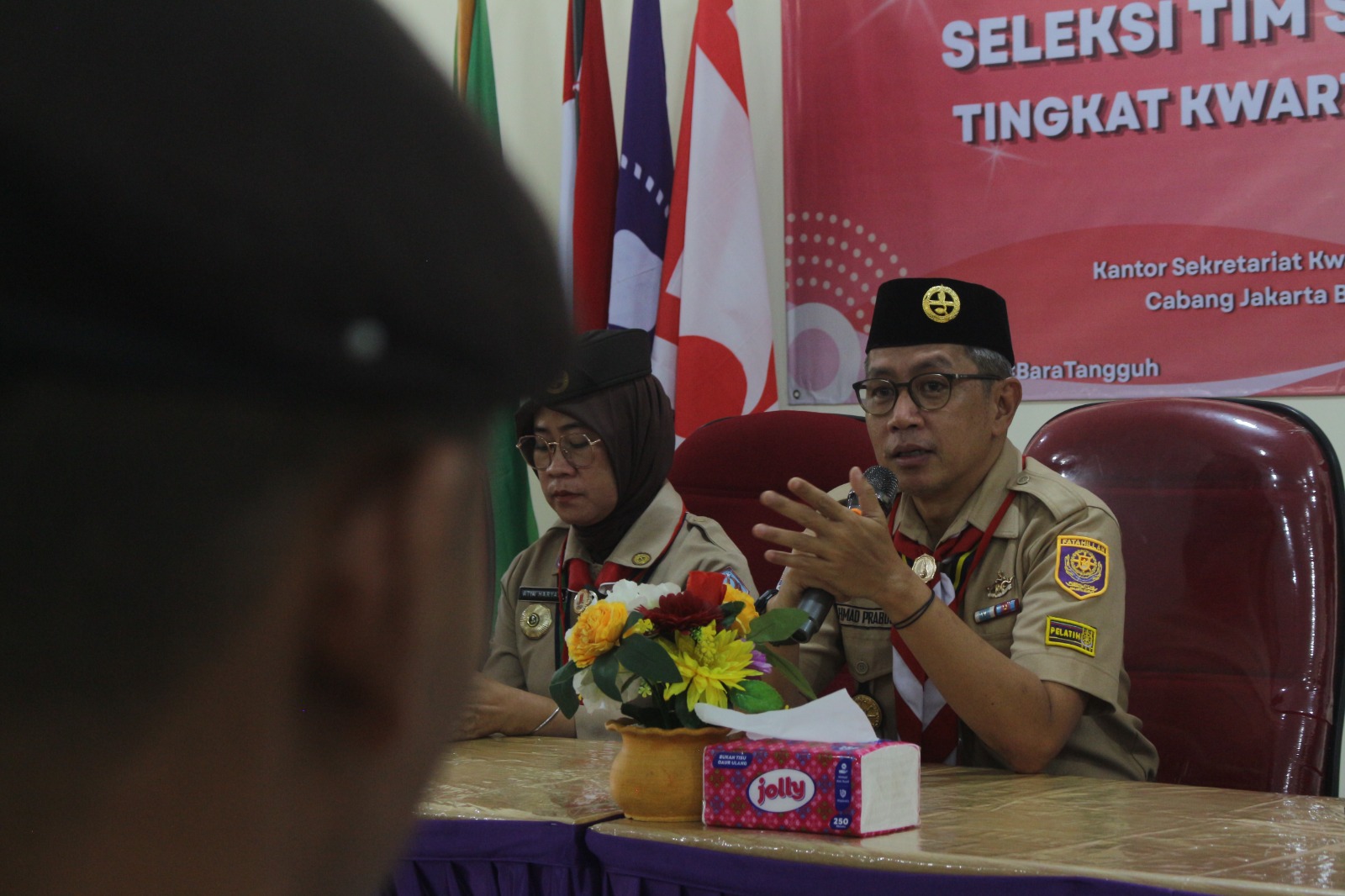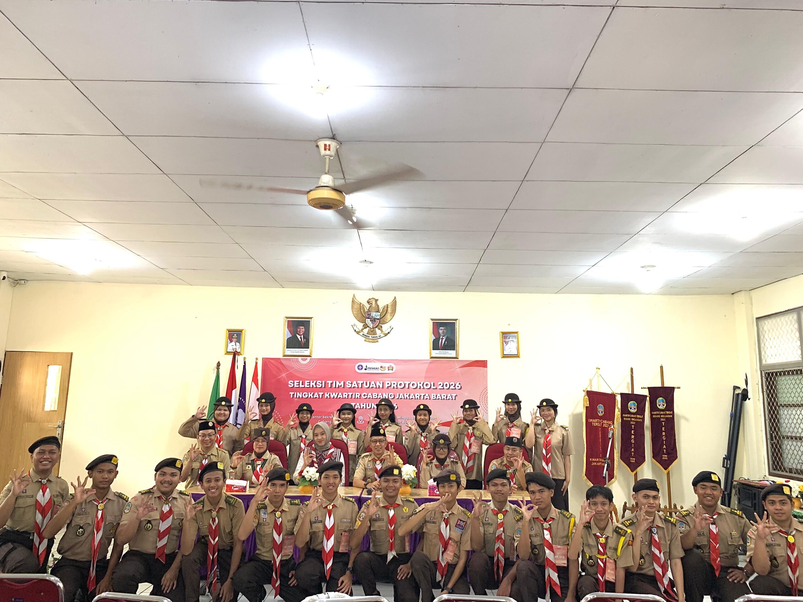 Jakarta Barat — Kwartir Cabang (Kwarcab) Gerakan Pramuka Jakarta Barat menggelar Seleksi Tim Satuan Protokol tingkat cabang pada Minggu (26/4) di Gedung Sekretariat Kwarcab Jakarta Barat. Sebanyak 15 Pramuka Penegak dan Pandega mengikuti kegiatan ini untuk memperebutkan posisi dalam tim protokol tahun 2026.