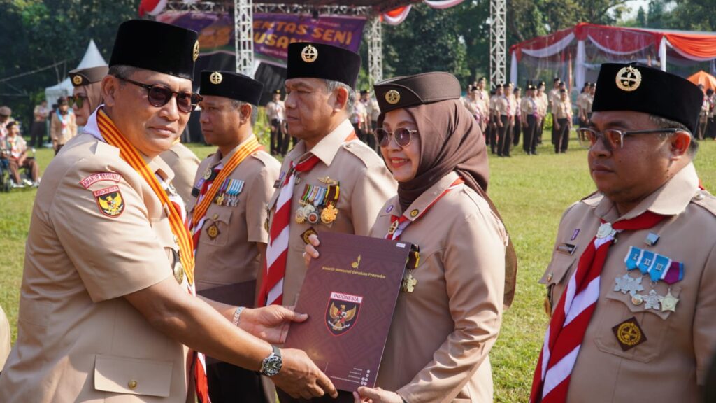 Jakarta – Kwartir Nasional (Kwarnas) Gerakan Pramuka menganugerahkan tanda penghargaan Lencana Darma Bakti kepada Bendahara Kwartir Daerah (Kwarda) Gerakan Pramuka DKI Jakarta, Kak Hj. Sri Utami, S.K.M. Penganugerahan ini diberikan berdasarkan Surat Keputusan Kwarnas Nomor 132 Tahun 2025, Nomor 133 Tahun 2025, dan Nomor 135 Tahun 2025.