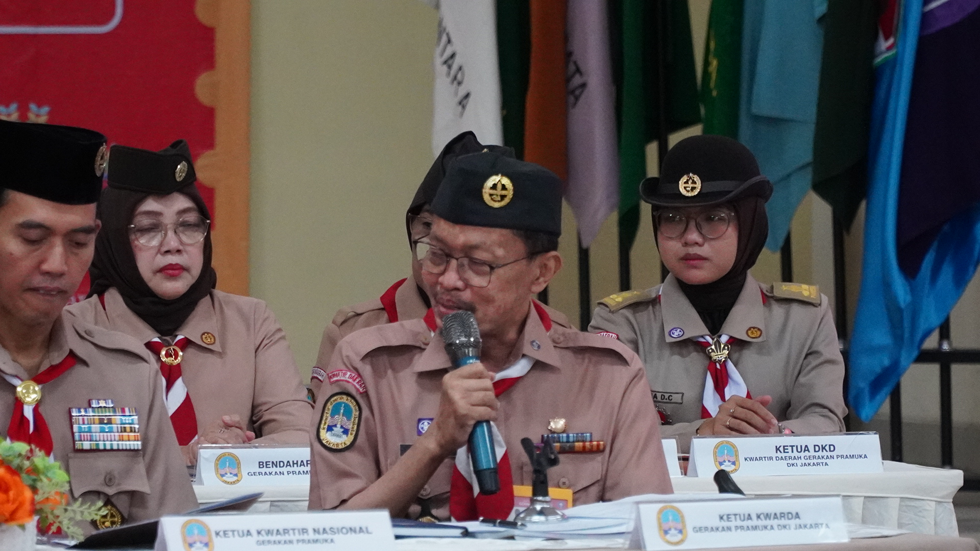 Jakarta — Ketua Kwartir Daerah (Kwarda) Gerakan Pramuka DKI Jakarta Kak Isnawa Adji memaparkan laporan kegiatan tahun 2025 dalam bentuk Annual Report pada Rapat Kerja Daerah (Rakerda) Kwarda DKI Jakarta yang digelar di Gedung Kwarda DKI Jakarta, Sabtu (7/3/2026).
