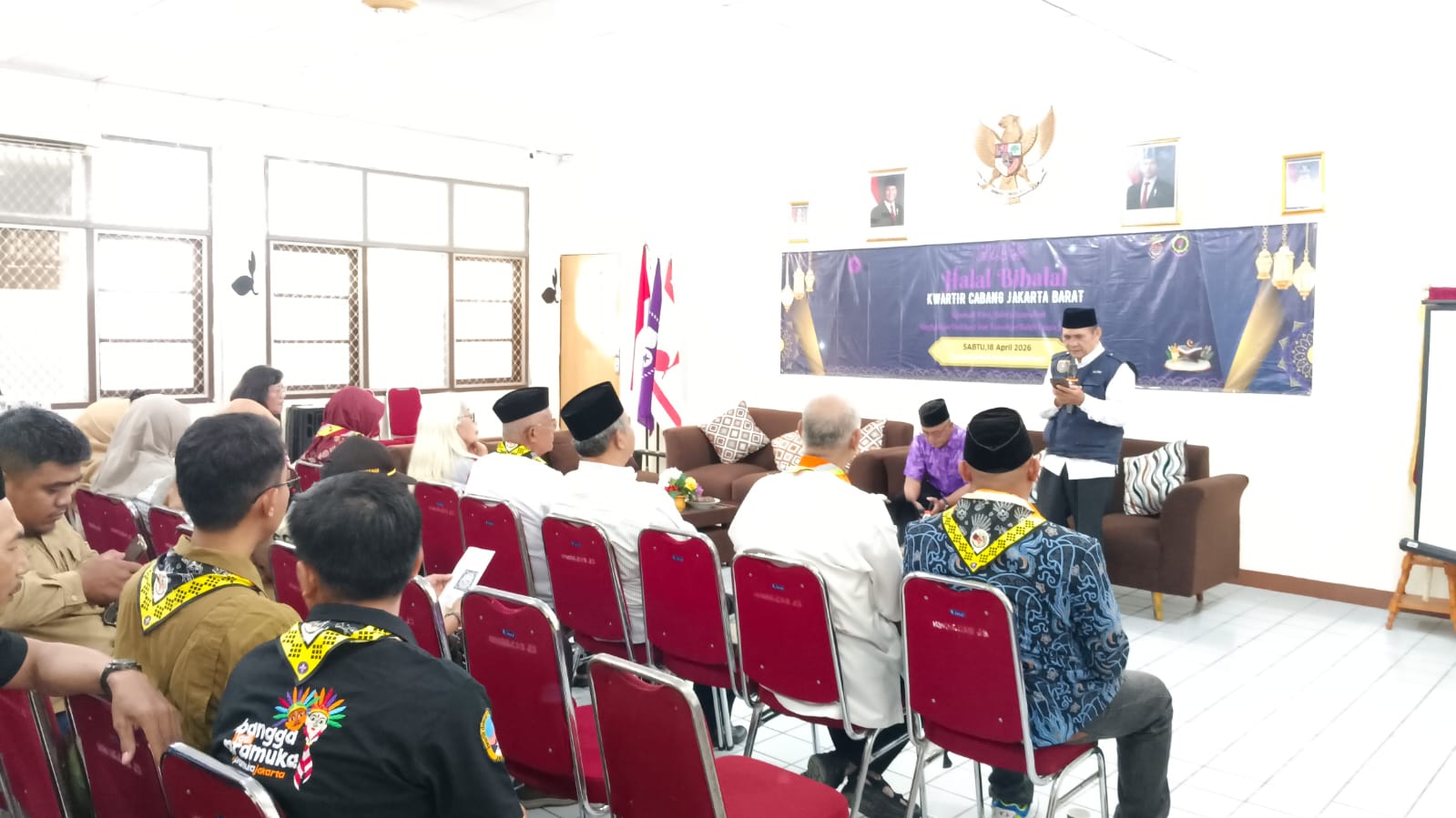 Jakarta Barat — Kwartir Cabang Gerakan Pramuka Jakarta Barat menggelar kegiatan halalbihalal bagi para pelatih Pusat Pendidikan dan Pelatihan Cabang (Pusdiklatcab) pada Sabtu, 18 April 2026. Acara berlangsung di Aula Gedung Kwarcab Jakarta Barat dan dihadiri sekitar 30 peserta.
