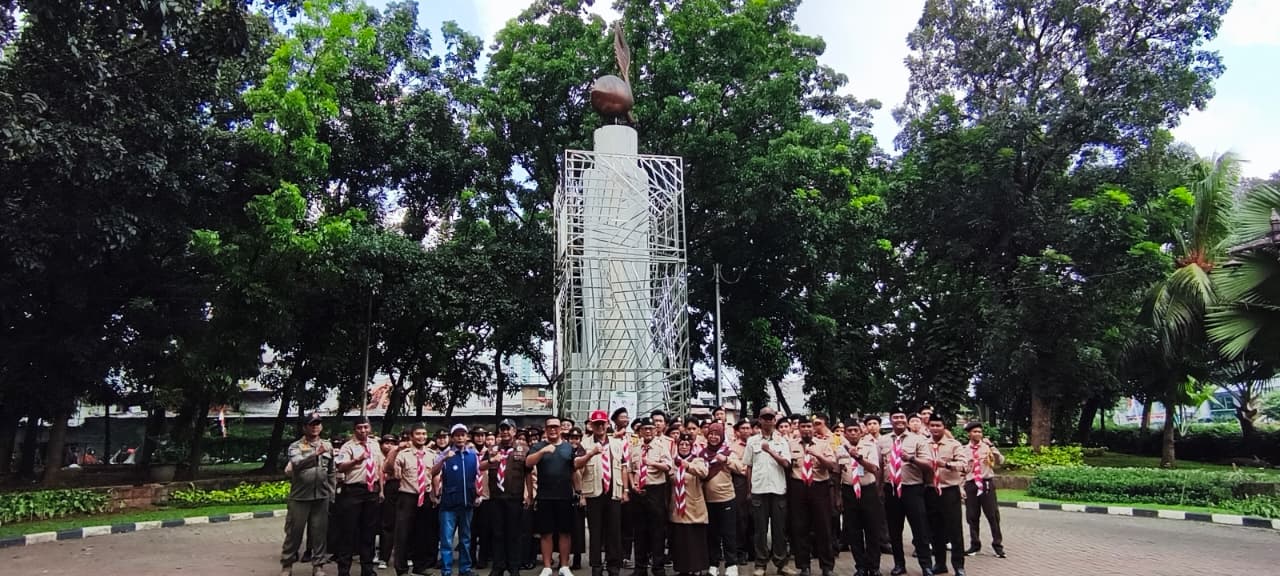 Keren! 100 anggota Pramuka Jakarta Pusat Gelar Aksi Bersih Tugu Pramuka di Bulan Bakti