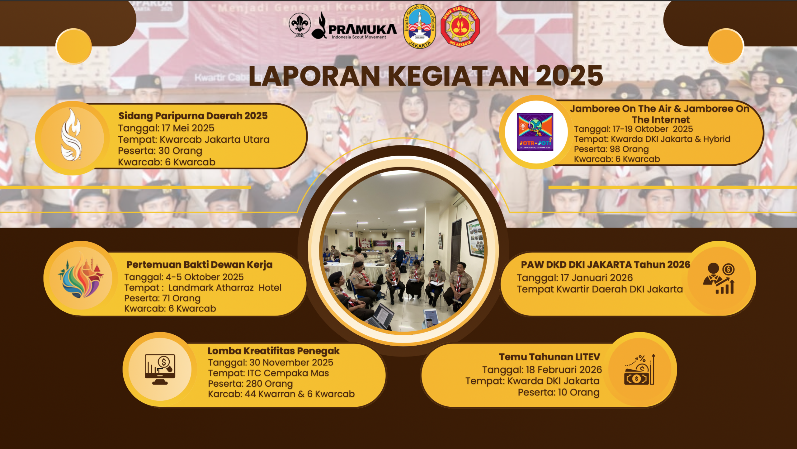 Ia juga menyampaikan bahwa sepanjang tahun 2025, Dewan Kerja Daerah DKI Jakarta telah melaksanakan berbagai kegiatan yang melibatkan seluruh enam Kwartir Cabang se-DKI Jakarta. Beberapa kegiatan yang dilaksanakan di antaranya Sidang Paripurna Daerah 2025, Jamboree On The Air (JOTA) dan Jamboree On The Internet (JOTI), serta berbagai kegiatan partisipatif lainnya yang diikuti ratusan peserta dari unsur Pramuka Penegak dan Pandega.