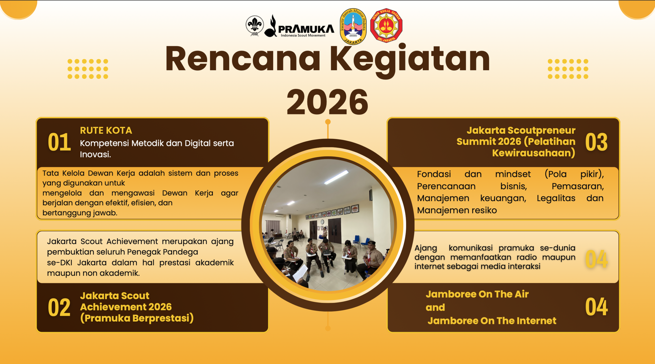 DKD DKI Jakarta juga merencanakan kegiatan Jakarta Scoutpreneur Summit 2026, yaitu pelatihan kewirausahaan yang bertujuan membekali anggota Pramuka dengan keterampilan bisnis, mulai dari perencanaan usaha, pemasaran, manajemen keuangan, hingga pengelolaan risiko usaha.