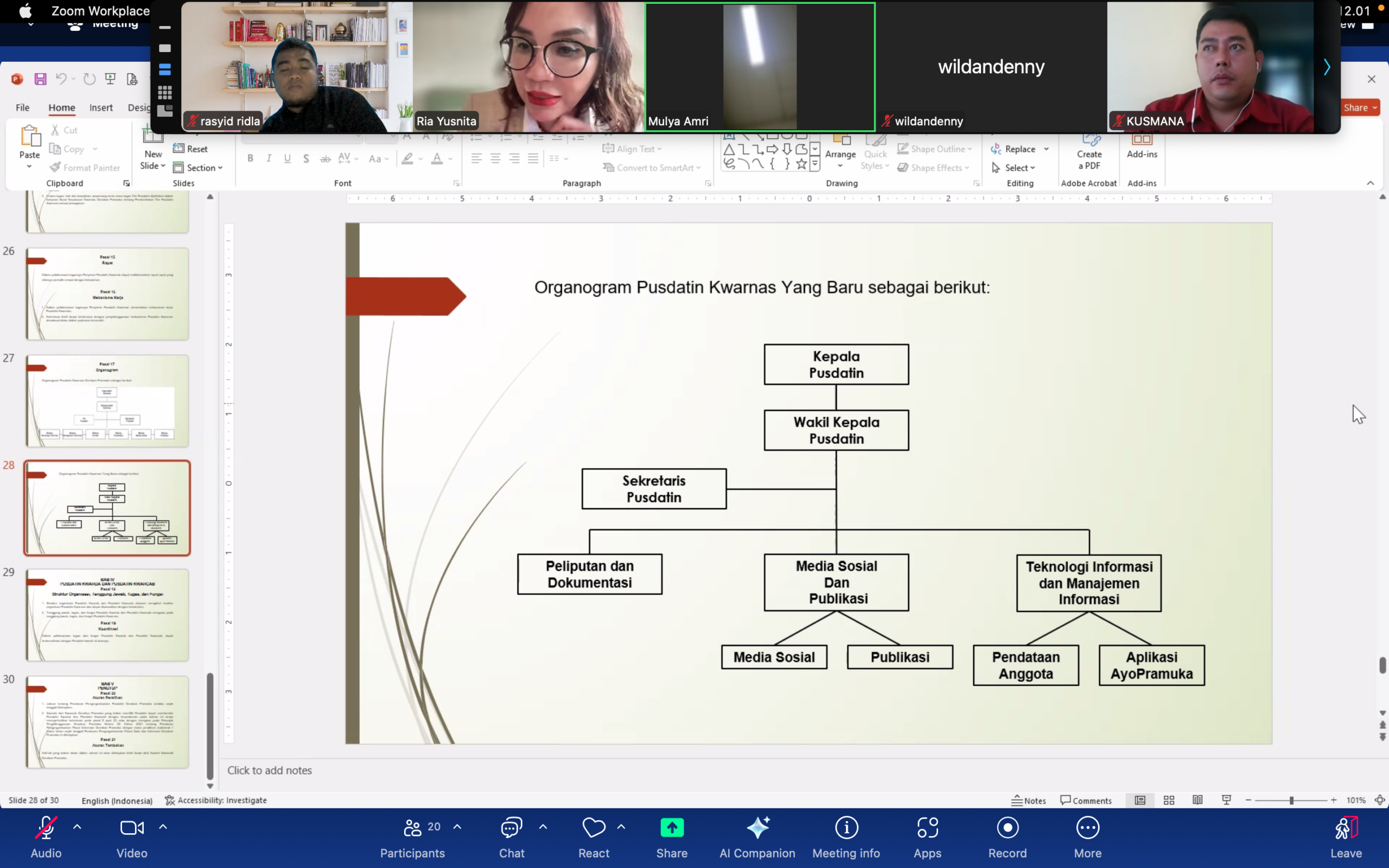 Pada kesempatan tersebut, Kak Ria juga menyampaikan informasi mengenai akun media sosial resmi Kwartir Nasional Gerakan Pramuka yang meliputi Instagram, TikTok, YouTube, dan Facebook. Selain itu, ia memaparkan struktur organisasi Pusdatin Kwarnas yang baru, terdiri atas Kepala Pusdatin, Wakil Kepala, Sekretaris, serta tiga bidang utama, yakni Bidang Peliputan dan Dokumentasi, Bidang Media Sosial dan Publikasi, serta Bidang Teknologi Informasi dan Manajemen Informasi.