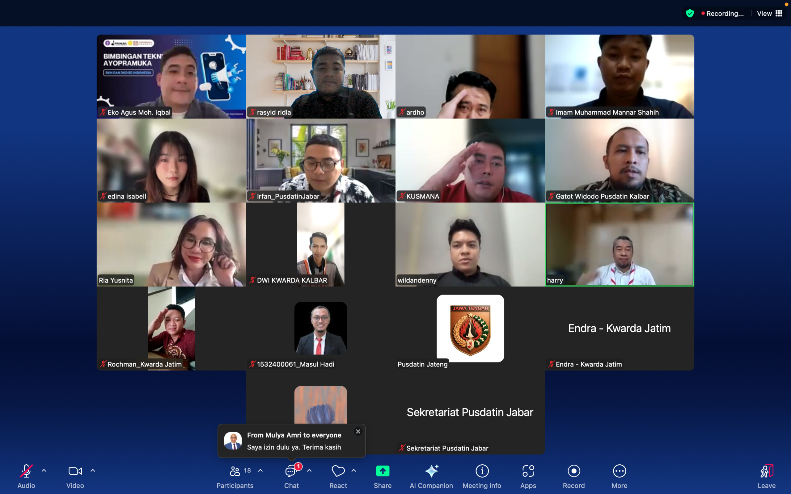 Jakarta — Kwartir Daerah Gerakan Pramuka DKI Jakarta menghadiri Rapat Pusat Data dan Informasi (Pusdatin) yang diselenggarakan oleh Kwartir Nasional Gerakan Pramuka secara daring pada 15 Januari 2026. Rapat ini menjadi forum koordinasi awal tahun 2026 untuk memperkuat sinergi pengelolaan data, teknologi informasi, serta publikasi kepramukaan di tingkat nasional dan daerah.