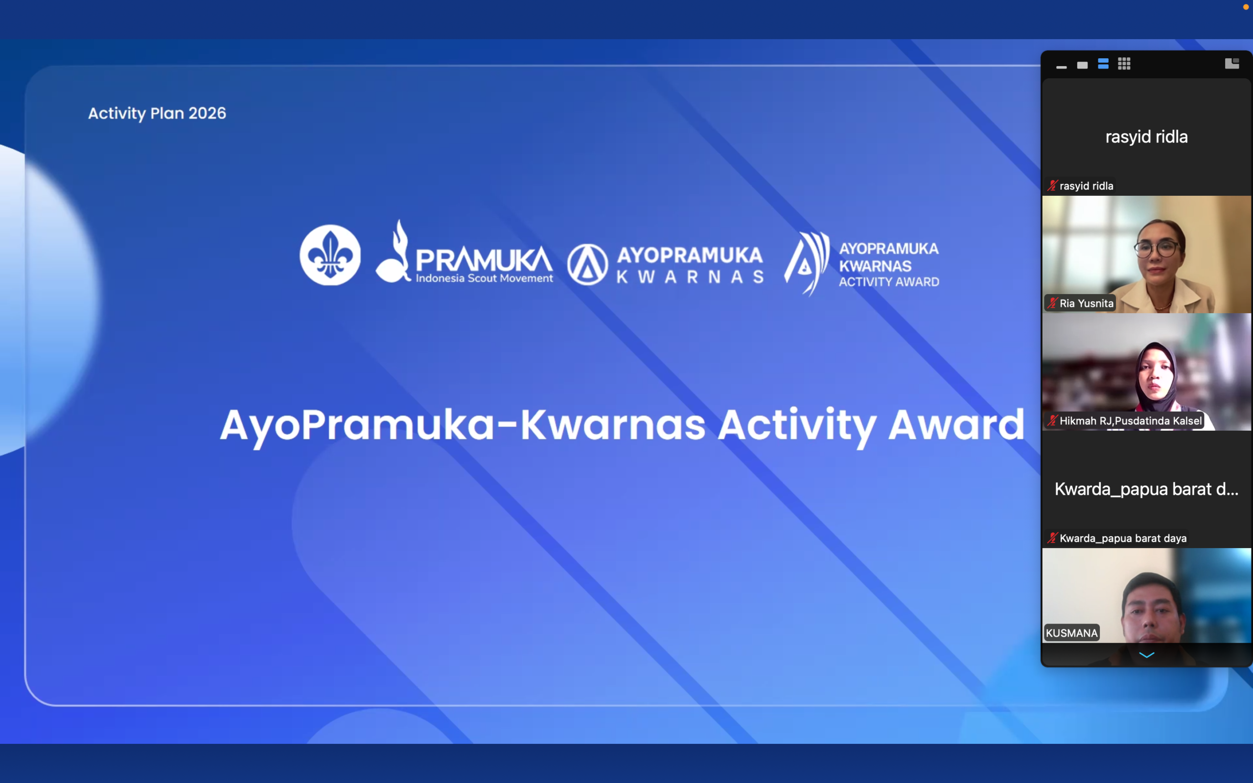 Jakarta — Kwartir Nasional (Kwarnas) Gerakan Pramuka menggelar rapat koordinasi bersama para Kepala Pusat Data dan Informasi (Pusdatin) Kwartir Daerah se-Indonesia pada Senin (13/4/2026) secara online. Kegiatan yang berlangsung mulai pukul 13.00 WIB ini menjadi bagian dari persiapan pelaksanaan Launching AyoPramuka – Kwarnas Activity Award Tahun 2026.