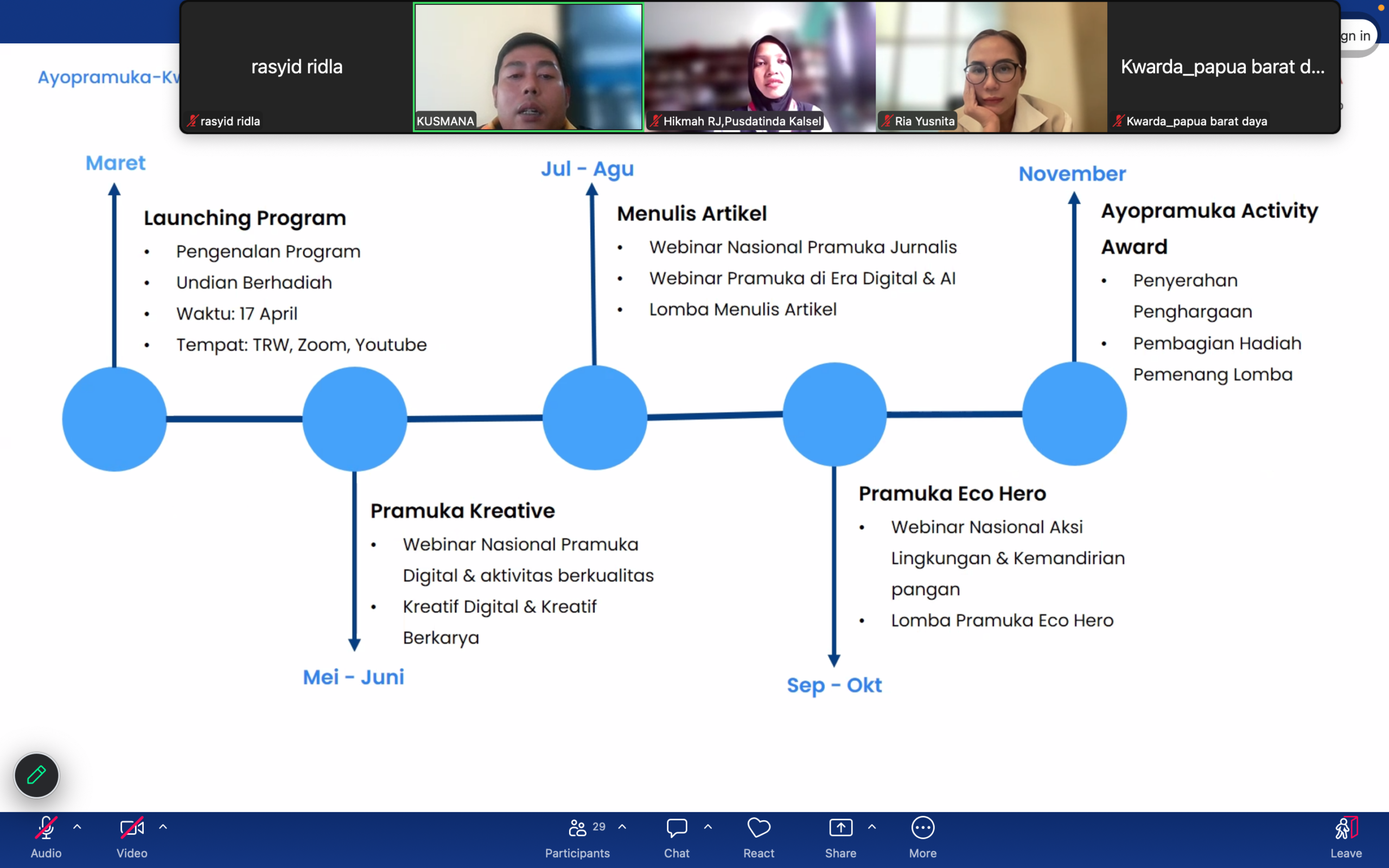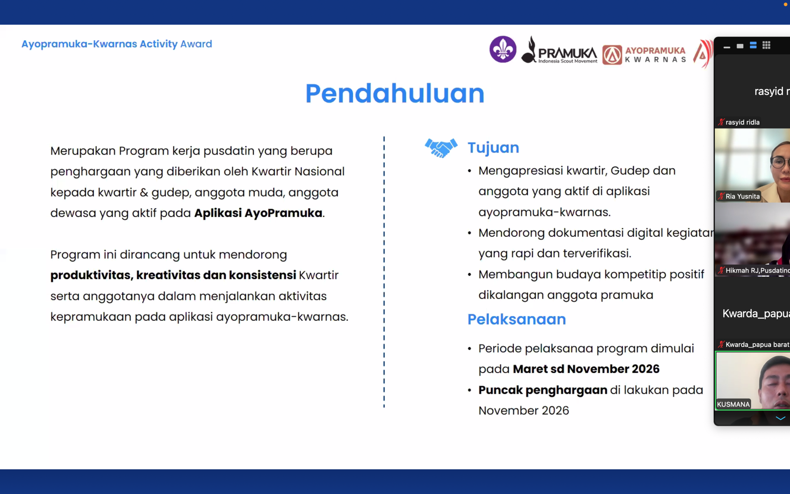 Kepala Pusdatin Kwarnas, Kak Ria Yusnita, dalam arahannya menyampaikan bahwa kegiatan puncak AyoPramuka – Kwarnas Activity Award direncanakan berlangsung pada November 2026, dengan target ambisius mencapai dua juta pengguna aplikasi.