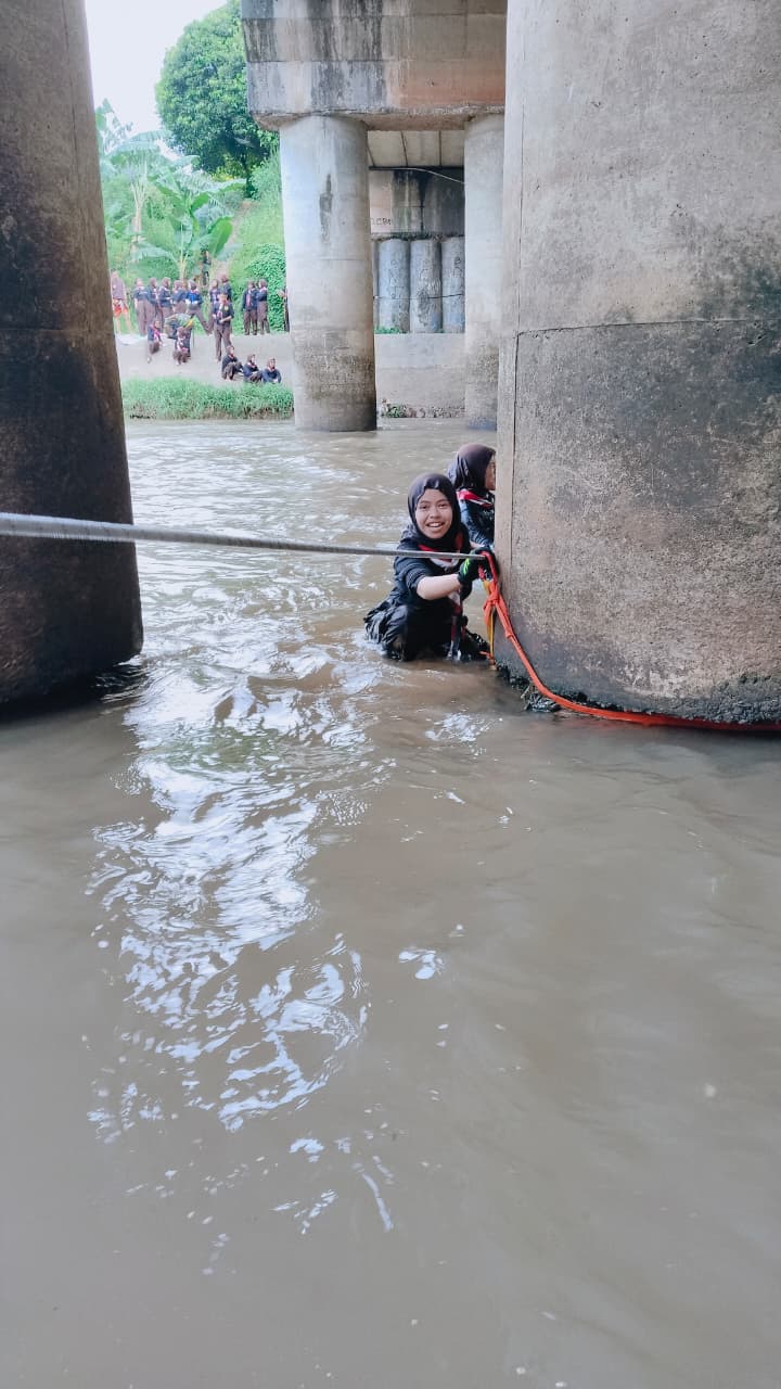 Usai istirahat, salat, dan makan (ishoma), kegiatan dilanjutkan dengan praktik penyebrangan basah, yaitu teknik melintasi arus air menggunakan alat pengamanan. Kegiatan ini menjadi salah satu bagian penting dalam melatih keberanian serta ketahanan mental peserta dalam situasi berisiko.