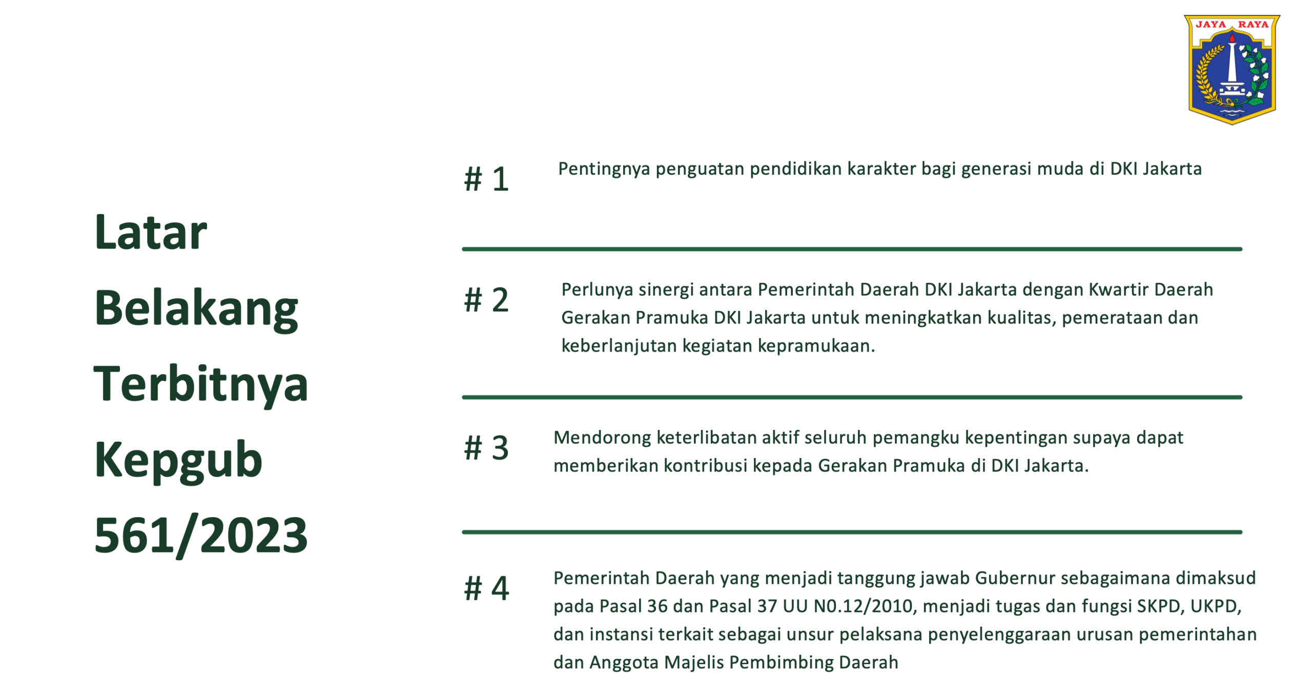 Ia menjelaskan, sebagai bentuk komitmen tersebut, Pemerintah Provinsi DKI Jakarta telah menerbitkan Keputusan Gubernur Nomor 561 Tahun 2023 yang menjadi landasan kebijakan dukungan Pemda terhadap Gerakan Pramuka di DKI Jakarta. Kebijakan ini dilatarbelakangi oleh pentingnya penguatan pendidikan karakter, perlunya sinergi berkelanjutan antara Pemda dan Kwartir Daerah, serta dorongan keterlibatan aktif seluruh pemangku kepentingan.