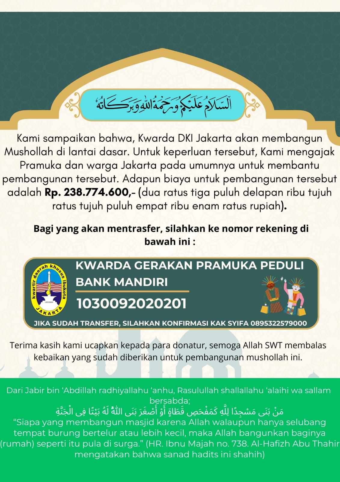 Untuk merealisasikan pembangunan tersebut, Kwarda DKI Jakarta mengajak seluruh anggota Gerakan Pramuka serta masyarakat Jakarta untuk turut berpartisipasi dan memberikan dukungan. Total anggaran yang dibutuhkan dalam pembangunan musholla ini mencapai Rp234.774.600.