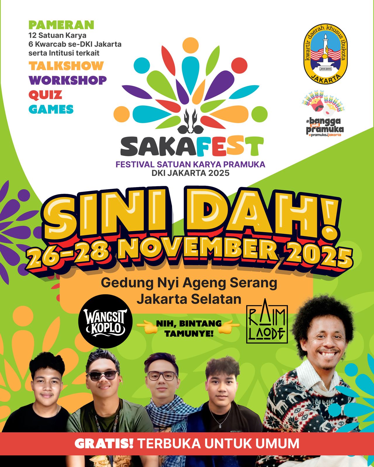 Jakarta – Kwartir Daerah Gerakan Pramuka DKI Jakarta akan menyelenggarakan Saka Fest 2025 pada 26–28 November 2025 di Gedung Nyi Ageng Serang, Kuningan, Jakarta Selatan. Festival ini menjadi puncak rangkaian kegiatan Satuan Karya (Saka) tahun 2025 dan dirancang sebagai ruang besar untuk kolaborasi, pembelajaran, dan silaturahmi Pramuka se-DKI Jakarta.