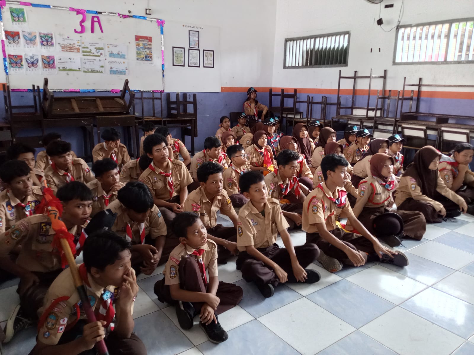 Jakarta Utara — Sebanyak 43 anggota Pramuka penggalang mengikuti kegiatan penyelesaian Tanda Kecakapan Khusus (TKK) pemadam kebakaran yang dilaksanakan pada Sabtu (18/4) pukul 10.30 hingga 12.00 WIB di SMP Sari Putra.